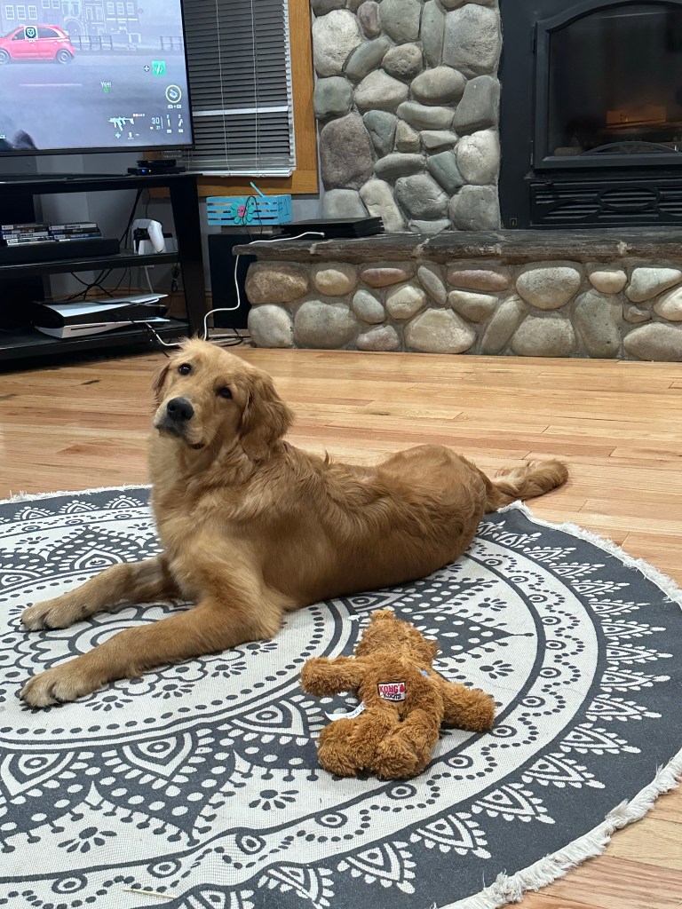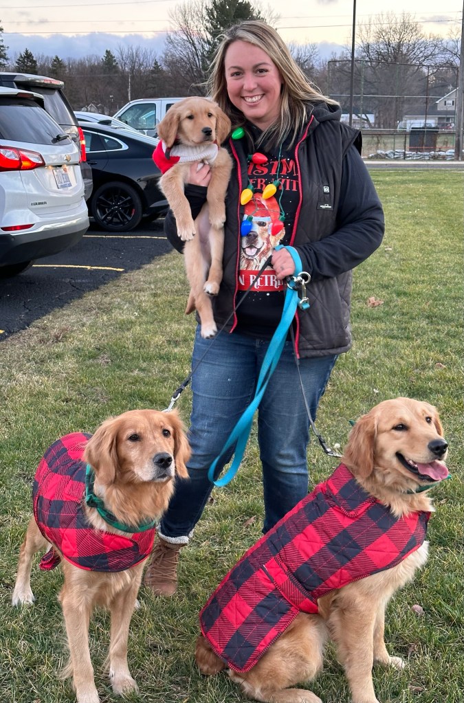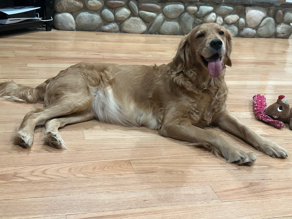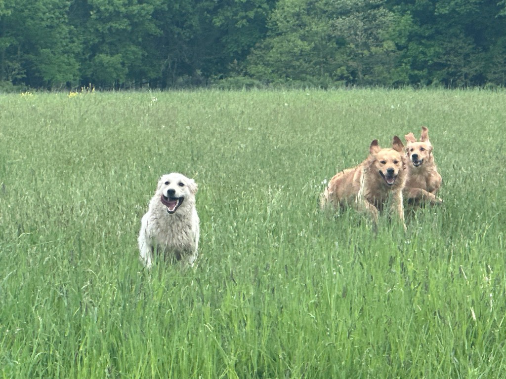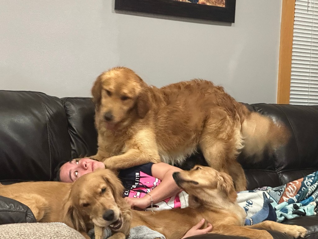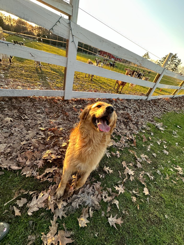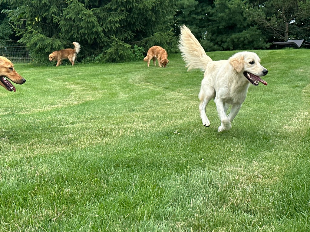 All of our goldens free range the farm when we are home. They love to run the fields, play in the mud, harass the chickens and go on car rides! In the winter we take at least 3 pups to the parade in Fenton, MI and walk with other goldens! They love the outdoor life but at night they can be found snuggled up on the sofa, leaving us no where to sit 😂