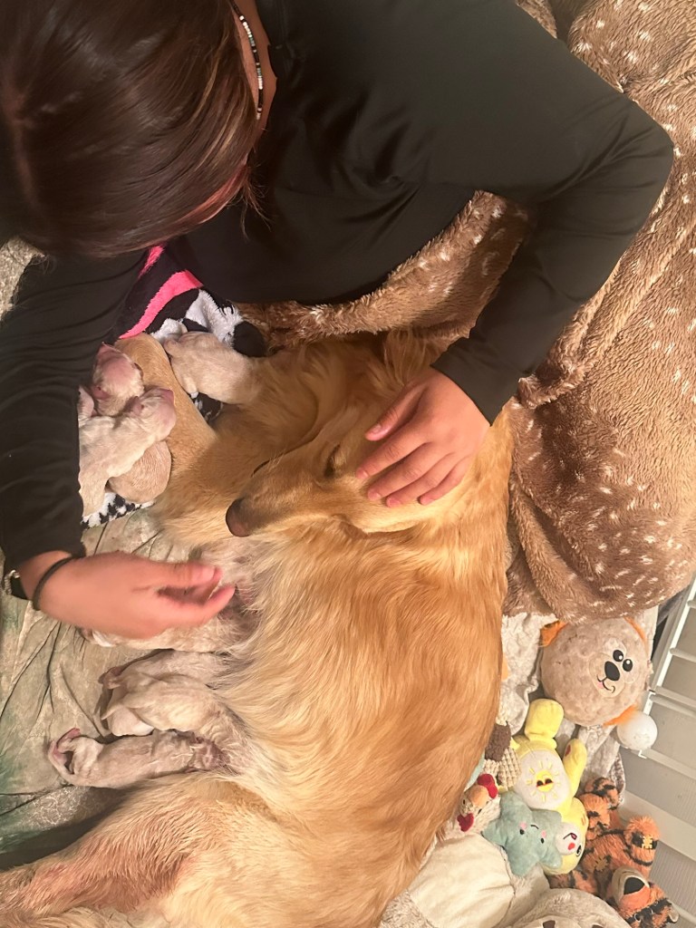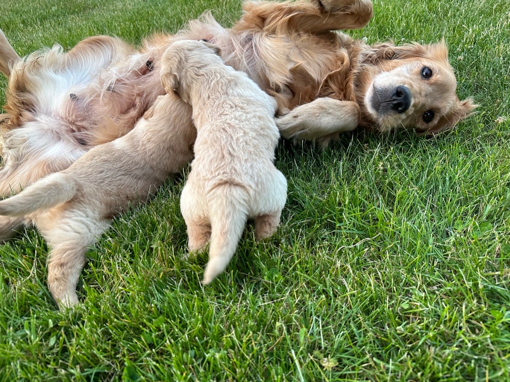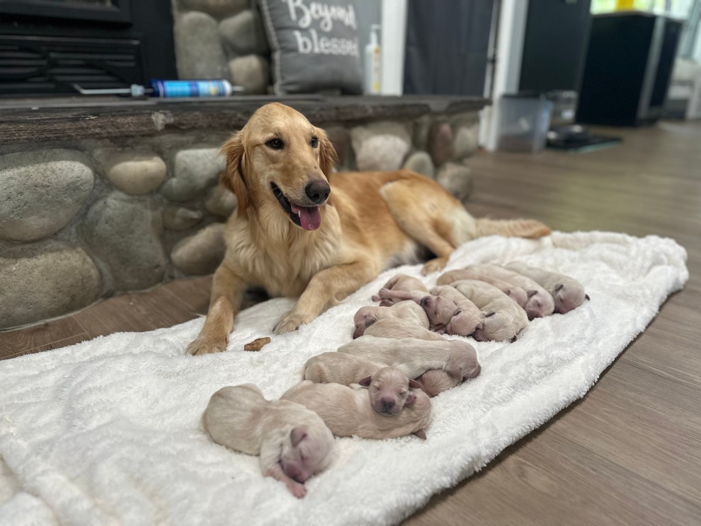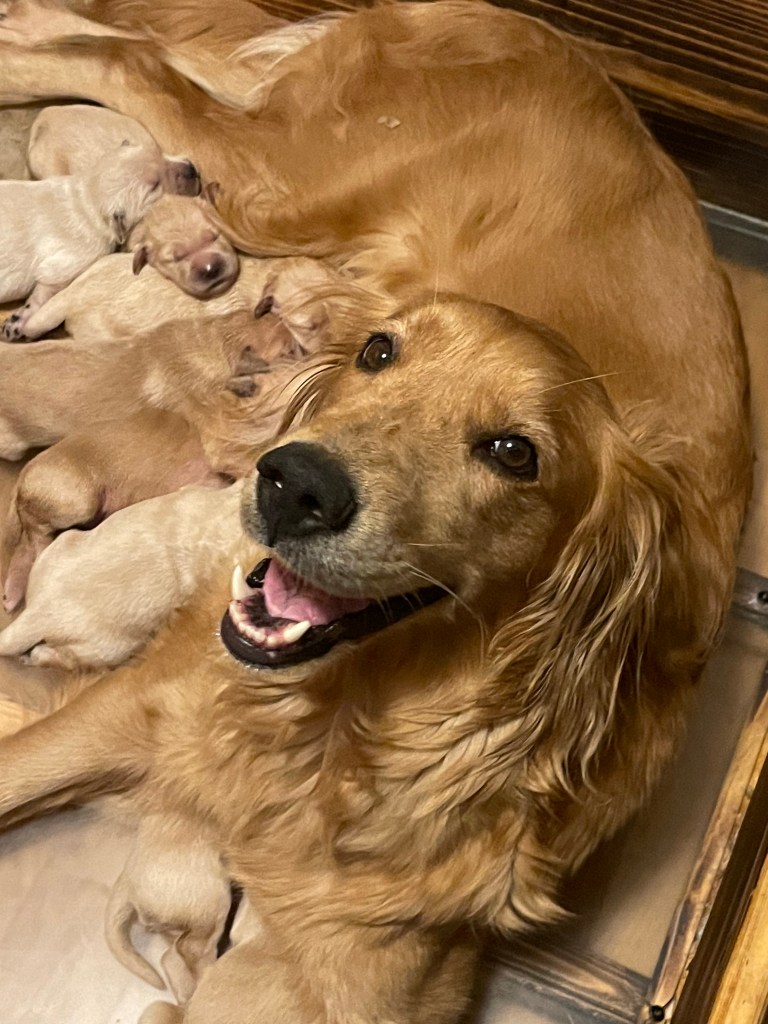 Bella was our first golden on the farm and like everyone says, once you own a golden you will forever need one 🐾 She raised 3 beautiful litters for us and will raise her final in 2024. Upon retiring, Bella will be enjoying the farm life here with us for the rest of her days 💛