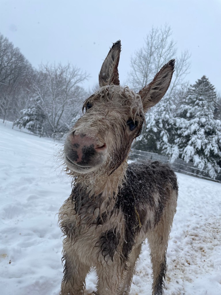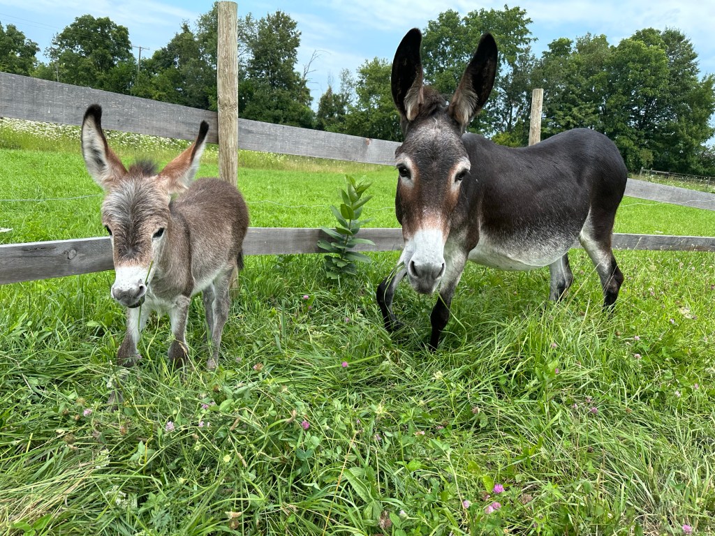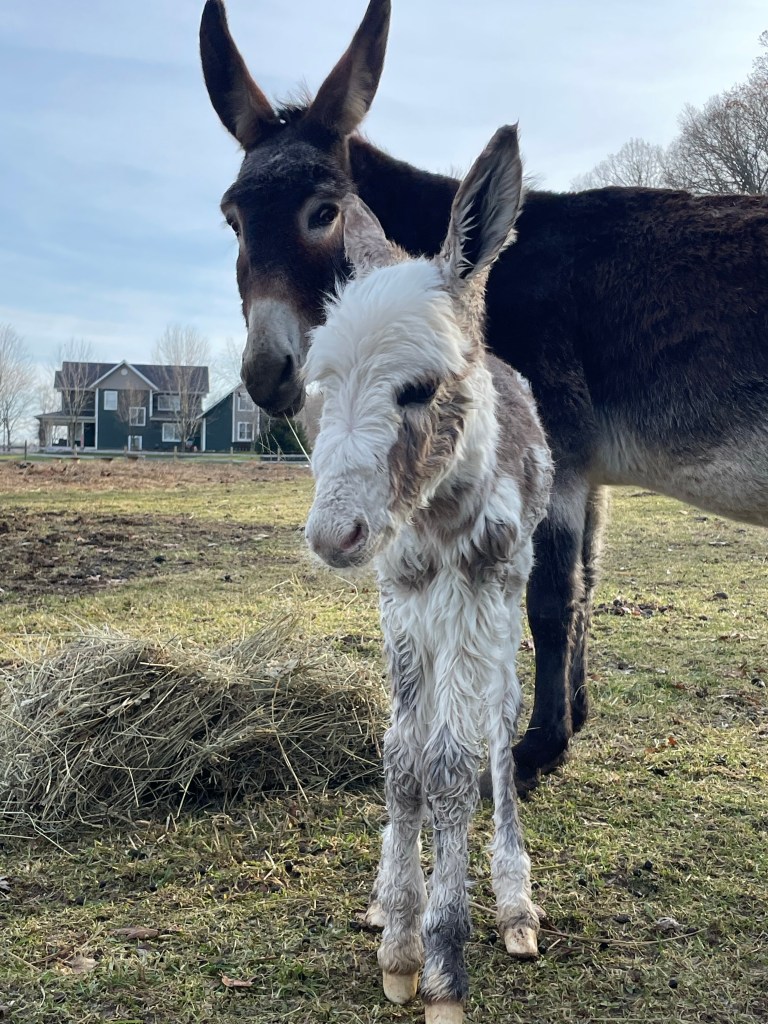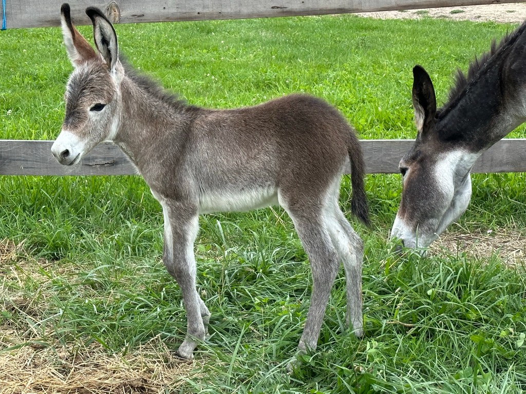 Donkeys are similar to horses but in sooo many ways 100% different. They radiate a calming aura when you are around them. They do not startle easily and are very curious. They do best on a dry lot and strive for attention. We have a baby born on the farm every 16-18 months and it’s always a special treat when they are born 💜